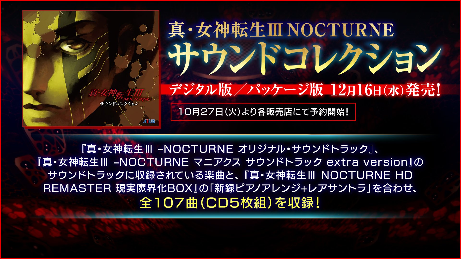 これは、詳細で元の投稿訪問用の 真 女神転生 シリーズ公式 On Twitter 真3hd 限定版 現実魔界化box に同梱されるサントラが ゲーム本編 真 女神転生 Nocturne シリーズの全ての楽曲を収録した 真 女神転生 Nocturne サウンドコレクション として12月16日にパッケージ版 Cd5枚組全107 のスニペット画像です。 ここに