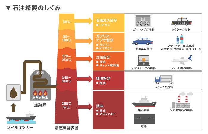ある物質の沸点に到達すると温度変化が一定になるから沸点に達していることはわかるから大丈夫 原油の蒸留について調べてみるといいね. 我が国ではほとんどが原油を蒸留精製することにより石油製品に転換されて販売されています石油製品については輸入と輸出が行われています2011年度に販売された石油製品は燃料油合計で1億9013万klでありここ数年は減少傾向になりました油種別販売構成をみますとBC重油 15 販売.